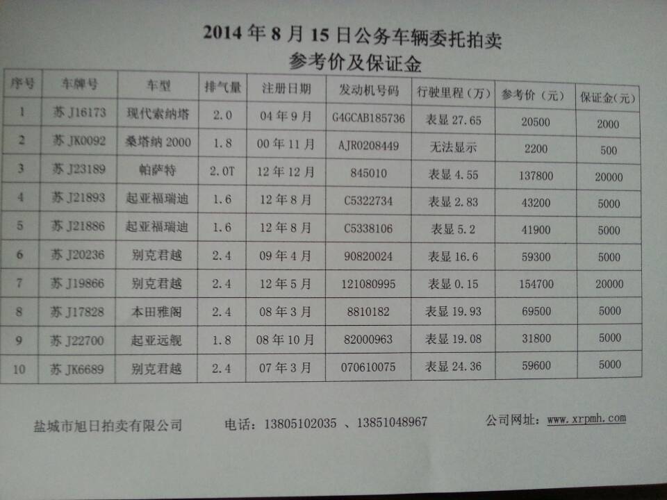 四、标的展示时间及地点:自公告日起至拍卖日前在盐城市亭湖区文化艺术中心西侧停车场展示(2014年8月12日上午9时30分集中展示)。